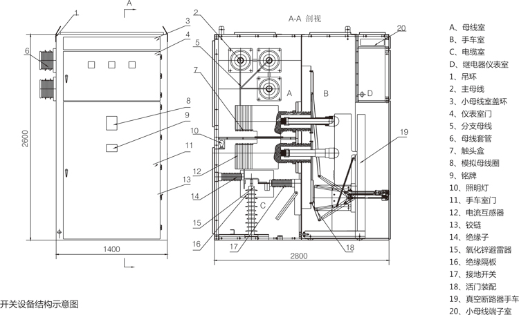 本開關(guān)設(shè)備具有電纜進(jìn)出線、架空進(jìn)出線、母線聯(lián)絡(luò)、隔離、電壓互感器、避雷器等主電路方案。母線采用復(fù)合絕緣,相間及連接頭配有用阻燃材料注塑而成的絕緣套,主母線相鄰柜間用母線套管隔開,能有效地防止事故蔓延,同時對主母線起到輔助支撐作用。電纜室裝有接地開關(guān)、過電壓保護(hù)裝置等。