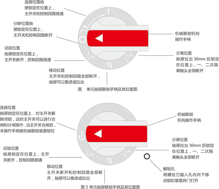 ◎ 抽屜單元有可靠的機械聯(lián)鎖位置。通過操作手柄控制,具有明顯準確的合閘、試驗、抽出和隔離位置。操作機構功能見圖4、圖5。